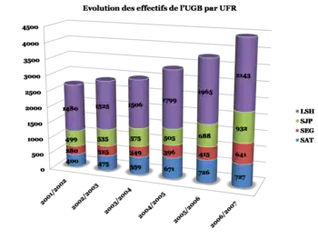 L'université a ouvert ses portes en 1990 avec un effectif de 600 étudiants. Ce nombre n'a cessé d'augmenter depuis cette date. Le début des années 2000 a vu la cadence commencer à s'accélérer (voir tableau). Certains accusent la banque mondiale de faire des pressions pour que le nombre d'étudiants augmente plus rapidement à cause de la faible absorption de l'UGB : environ pas plus de 600 étudiants en moyenne sont admis à l'UGB sur les 10 000 bacheliers annuels du Sénégal. Face à cette pression il y a la résistance des étudiants qui souhaitent une évolution des infrastructures à la même cadence. Les graphiques suivants montre l'évolution depuis 2001[2].