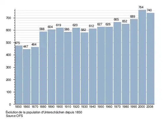 Le graphique suivant résume l'évolution de la population d'Unterschächen entre 1850 et 2008[3] :