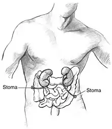 Les urètres sont reliés directement à la paroi abdominale afin de créer deux stomates (Stomas en anglais sur l'image).