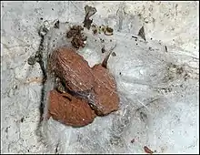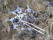 Qui plus est, une étrange particularité inédite a été découverte une vingtaine de fois (Saint Chinianais) par A.Lopez (1973[6],1983[5]) dans le cas de grosses toiles habitées par des Uroctea femelles adultes : la présence de petites structures étrangères au nombre de 2 à 5, en forme de tonnelet ridé, fixées sur la pierre, sous la face plane de la toile, construites avec de l' argile rouge de décalcification et contenant...de petites Araignées, certaines encore vivantes mais paralysées et amputées de leurs pattes, ainsi que des larves et pupes d'Hyménoptères. Appartenant à diverses familles (Drassidae, Clubionidae, Salticidae), ces proies elles avaient été sans aucun doute capturées, paralysées et entreposées en cellules d' argile par des Pompilides Agenia ou Deuteragenia sp.[6],[5]. Il semblerait que ces Hyménoptères choisissent la toile d'Uro ctée soit comme abri protecteur "douillet" pour leurs larves et les proies emmagasinées, soit parce qu'il leur procure un microclimat favorable. Une telle cohabitation n'est d'ailleurs pas sans risques pour le Pompilide puisque Jeannin (1975[7]), étudiant le régime alimentaire d'Uroctea dans une autre partie de l' Hérault, y a constaté, non sans surprise, une Agenia parmi les débris de proies.