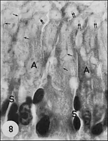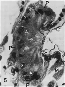 L'Uroctée, comme les autres Araignées, est pourvue de glandes segmentaires, certaines très développées notamment à la base du rostre et sur le bord du pharynx, cette dernière localisation correspondant au prétendu organe du "goût" de Millot, qui, en fait, n'est pas gustatif, donc non nerveux, mais sécrétant [4] (Fig.5,6).