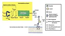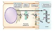 La séquence protéique (figure 3) contient un peptide signal N-terminal de 24 acides aminés, suivi de trois domaines analogues à un facteur de croissance épidermique (EGF pour Epidermal Growth Factor), un domaine zona pellucida (en) (ZP) et un site de fixation d'ancrage GPI[8]. Le peptide C-terminal d'origine intracellulaire est constitué d'acides aminés hydrophobes qui agissent comme un signal pour la ER-transpeptidase (ER pour Réticulum Endoplasmique)[8]. Après clivage du peptide hydrophobe par cette enzyme (ER-transpeptidase), une ancre GPI préformée est ajoutée à la « nouvelle » extrémité C-terminale[9]. Après une maturation supplémentaire dans l'appareil de Golgi, l'uromoduline est transportée vers la membrane plasmique apicale sous forme de polymères libérés dans la lumière (tubulaire) après clivage protéolytique (destruction des protéines en leurs éléments constitutifs, qui est assurée dans la cellule vivante par des enzymes dites protéolytiques ; en biochimie, la protéolyse est l'hydrolyse des protéines sous l'action des enzymes : la protéine se décompose en plusieurs morceaux) par une protéase inconnue (figure 4)[9]. Le clivage est nécessaire pour la polymérisation des monomères d'uromoduline dans la lumière tubulaire, processus probablement facilité par le domaine ZP[9].