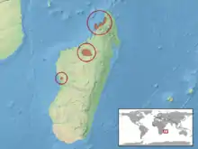Cette espèce est endémique du Nord de Madagascar[1]. Elle se rencontre dans la moitié nord de la côte ouest de l'île. Sa répartition passée était probablement largement plus étendue dans cette zone mais la déforestation a morcelé son habitat et il semble ne plus se rencontrer que dans trois zones : sur l'île de Nosy Be et la côte adjacente, autour du parc national d'Ankarafantsika et dans la région de Morondava. Il semble que les populations de ce dernier lieu aient évolué en une forme plus grande et présentant une coloration plus sombre que les autres populations[2].