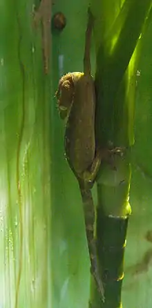 Ce gecko vit dans les forêts de bambou de l'île, sur les troncs.