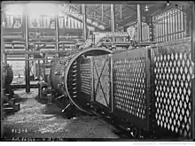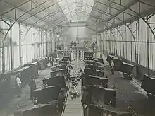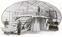 Les pavés de bois étaient soigneusement empilés sur une chaîne de montage dans des wagons spéciaux à voie étroite et à parois latérales perforées, qui les amenaient d'abord à l'atelier de créosote, puis dans les entrepôts où ils étaient empilés jusqu'à ce qu'ils soient transportés vers les chantiers[1]. Les autoclaves étaient conçus comme des réservoirs sous pression, de sorte qu'ils pouvaient être partiellement évacués et chauffés pendant le processus d'imprégnation.