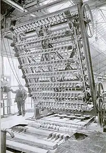 Aux débuts du pavage en blocs de bois à Paris, les blocs étaient sciés à l'aide de scies circulaires ou à ruban individuelles. Par la suite, trois machines de quatre ou cinq scies chacune ont été installées dans les ateliers municipaux afin de répondre à la demande croissante. Chacune de ces machines se composait essentiellement d'un cadre oscillant, à l'extrémité inférieure duquel se trouvait un certain nombre de scies auxquelles les madriers étaient amenés un par un par un opérateur. Vers 1900, cet équipement ne suffisait plus et une méthode plus rapide devait être mise au point, car le rendement journalier d'une entreprise urbaine produisant 25 millions de pavés par an ne pouvait pas être régulier sans disposer d'importantes possibilités de stockage.