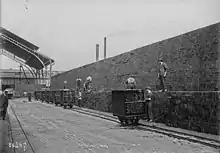 À partir de là, les blocs avançaient progressivement, au fur et à mesure qu'ils étaient poussés par les nouveaux blocs qui arrivaient. Lorsqu'ils atteignaient l'extrémité de la table, ils glissaient sur deux plans inclinés, divisés en 16 compartiments par des cloisons verticales, jusqu'aux trois bandes d'un convoyeur horizontal, d'où ils étaient pris en charge par une équipe de huit ouvriers et empilés dans des wagonnets. Les wagonnets chargés étaient transportés par les rails de chemin de fer Decauville vers l'installation de créosote, d'où les blocs imprégnés de créosote étaient poussés vers les halls de stockage.