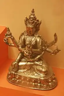 Uṣṇīṣavijayā se tient au creux d'un édifice sacré; elle est blanche, à trois faces, à trois yeux, à huit bras, parée de toutes les parures; sur la lune d'un lotus épanoui elle se tient assise, les jambes étroitement croisées, à la façon des Bouddhas; son premier visage est blanc; celui de droite est jaune, celui de gauche est bleu et se presse la lèvre avec le creux des dents; de ses quatre mains droites, elle tient le foudre universel, le Bouddha Amitâbha posé sur un lotus rouge, la flèche, et fait le geste de la charité; de ses quatre mains gauches, elle tient l'arc, le lacet avec l'index levé, fait le geste de l'absence de crainte et tient le vase de fortune Vairocana siège dans sa tiare; d'étoffe divine sont faits sa jupe et son châle; qu'on la contemple, ainsi parée, au sein d'une gloire de blancheur[1]...