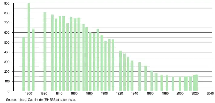 L'évolution du nombre d'habitants est connue à travers les recensements de la population effectués dans la commune depuis 1793. Pour les communes de moins de 10 000 habitants, une enquête de recensement portant sur toute la population est réalisée tous les cinq ans, les populations légales des années intermédiaires étant quant à elles estimées par interpolation ou extrapolation[24]. Pour la commune, le premier recensement exhaustif entrant dans le cadre du nouveau dispositif a été réalisé en 2008[25].
