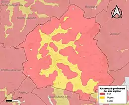 Les mouvements de terrains susceptibles de se produire sur la commune sont des affaissements et effondrements liés aux cavités souterraines (hors mines) et des tassements différentiels[18]. Afin de mieux appréhender le risque d’affaissement de terrain, un inventaire national permet de localiser les éventuelles cavités souterraines sur la commune[19]. Le retrait-gonflement des sols argileux est susceptible d'engendrer des dommages importants aux bâtiments en cas d’alternance de périodes de sécheresse et de pluie[20]. 99,9 % de la superficie communale est en aléa moyen ou fort (79,5 % au niveau départemental et 48,5 % au niveau national)[Carte 2]. Depuis le , en application de la loi ÉLAN, différentes contraintes s'imposent aux vendeurs, maîtres d'ouvrages ou constructeurs de biens situés dans une zone classée en aléa moyen ou fort[Note 3],[21].