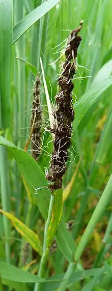Le charbon se caractérise par la formation d'amas noir de chlamydospores dans les épis. Il est dit « nu » car les enveloppes des fleurs sont détruites, seul persiste le rachillet principal.
