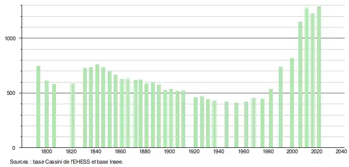 En 2021, la commune comptait 1 289 habitants[Note 9], en augmentation de 3,04 % par rapport à 2015 (Pyrénées-Atlantiques : +3,43 %, France hors Mayotte : +1,84 %).