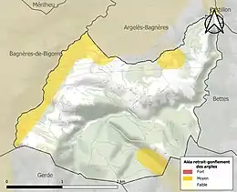 Le retrait-gonflement des sols argileux est susceptible d'engendrer des dommages importants aux bâtiments en cas d’alternance de périodes de sécheresse et de pluie. 15,1 % de la superficie communale est en aléa moyen ou fort (44,5 % au niveau départemental et 48,5 % au niveau national). Sur les 58 bâtiments dénombrés sur la commune en 2019, 4 sont en aléa moyen ou fort, soit 7 %, à comparer aux 75 % au niveau départemental et 54 % au niveau national. Une cartographie de l'exposition du territoire national au retrait gonflement des sols argileux est disponible sur le site du BRGM[23],[Carte 3].