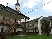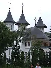 - Monastère de Sihăstria, dédié à la Dormition de la Vierge (Adormirea Maicci Domnului)[8], fondé en 1655, reconstruit en pierres en 1740 par l'évêque de Roman, Ghedeon de Husi avec son église en bois des Sts Voïvodes (Sf. Voievozi) de 1870[5].