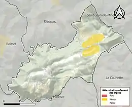Le retrait-gonflement des sols argileux est susceptible d'engendrer des dommages importants aux bâtiments en cas d’alternance de périodes de sécheresse et de pluie. 6,2 % de la superficie communale est en aléa moyen ou fort (59,3 % au niveau départemental et 48,5 % au niveau national). Sur les 61 bâtiments dénombrés sur la commune en 2019, 0 sont en aléa moyen ou fort, soit 0 %, à comparer aux 85 % au niveau départemental et 54 % au niveau national. Une cartographie de l'exposition du territoire national au retrait gonflement des sols argileux est disponible sur le site du BRGM[26],[Carte 2].