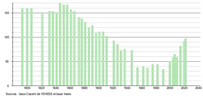 L'évolution du nombre d'habitants est connue à travers les recensements de la population effectués dans la commune depuis 1793. Pour les communes de moins de 10 000 habitants, une enquête de recensement portant sur toute la population est réalisée tous les cinq ans, les populations légales des années intermédiaires étant quant à elles estimées par interpolation ou extrapolation[29]. Pour la commune, le premier recensement exhaustif entrant dans le cadre du nouveau dispositif a été réalisé en 2004[30].