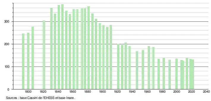 L'évolution du nombre d'habitants est connue à travers les recensements de la population effectués dans la commune depuis 1793. Pour les communes de moins de 10 000 habitants, une enquête de recensement portant sur toute la population est réalisée tous les cinq ans, les populations légales des années intermédiaires étant quant à elles estimées par interpolation ou extrapolation[27]. Pour la commune, le premier recensement exhaustif entrant dans le cadre du nouveau dispositif a été réalisé en 2008[28].