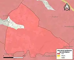 Le retrait-gonflement des sols argileux est susceptible d'engendrer des dommages importants aux bâtiments en cas d’alternance de périodes de sécheresse et de pluie. 95,3 % de la superficie communale est en aléa moyen ou fort (54,2 % au niveau départemental et 48,5 % au niveau national). Sur les 377 bâtiments dénombrés sur la commune en 2019, 278 sont en aléa moyen ou fort, soit 74 %, à comparer aux 57 % au niveau départemental et 54 % au niveau national. Une cartographie de l'exposition du territoire national au retrait gonflement des sols argileux est disponible sur le site du BRGM[14],[Carte 2].