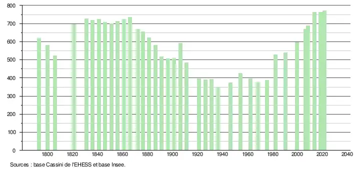 L'évolution du nombre d'habitants est connue à travers les recensements de la population effectués dans la commune depuis 1793. Pour les communes de moins de 10 000 habitants, une enquête de recensement portant sur toute la population est réalisée tous les cinq ans, les populations légales des années intermédiaires étant quant à elles estimées par interpolation ou extrapolation[18]. Pour la commune, le premier recensement exhaustif entrant dans le cadre du nouveau dispositif a été réalisé en 2008[19].