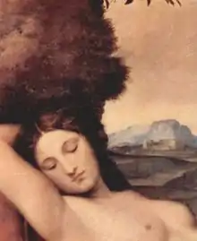 Le tableau représente une femme nue, langoureusement endormie à l'extérieur, allongée sur un drap blanc et un coussin recouvert d'un drap rouge, sur fond de paysage ouvert (les maisons sont identiques à celles du Noli me tangere du Titien). Comme l'ont confirmé les analyses aux rayons infrarouges, Le Titien a dû réparer certains dommages en réduisant la feuille et en élargissant le gazon, avec l'ajout de la toile rouge. La masse rocheuse sombre derrière la tête de la femme donne l'idée d'un ravin sous lequel elle repose ; Le Titien s'occupe aussi du ciel et du paysage, dont il se sert ensuite comme répertoire : on le retrouve à l'identique dans le Noli me tangere de Londres et en miroir dans Amour sacré et Amour profane[17].