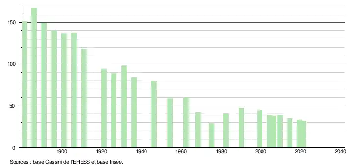 L'évolution du nombre d'habitants est connue à travers les recensements de la population effectués dans la commune depuis 1881. Pour les communes de moins de 10 000 habitants, une enquête de recensement portant sur toute la population est réalisée tous les cinq ans, les populations légales des années intermédiaires étant quant à elles estimées par interpolation ou extrapolation[29]. Pour la commune, le premier recensement exhaustif entrant dans le cadre du nouveau dispositif a été réalisé en 2004[30].