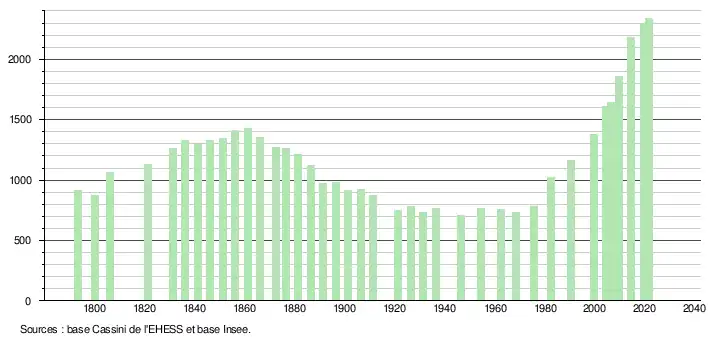 L'évolution du nombre d'habitants est connue à travers les recensements de la population effectués dans la commune depuis 1793. Pour les communes de moins de 10 000 habitants, une enquête de recensement portant sur toute la population est réalisée tous les cinq ans, les populations légales des années intermédiaires étant quant à elles estimées par interpolation ou extrapolation[20]. Pour la commune, le premier recensement exhaustif entrant dans le cadre du nouveau dispositif a été réalisé en 2004[21].