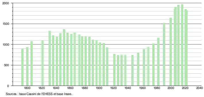 L'évolution du nombre d'habitants est connue à travers les recensements de la population effectués dans la commune depuis 1793. Pour les communes de moins de 10 000 habitants, une enquête de recensement portant sur toute la population est réalisée tous les cinq ans, les populations légales des années intermédiaires étant quant à elles estimées par interpolation ou extrapolation[20]. Pour la commune, le premier recensement exhaustif entrant dans le cadre du nouveau dispositif a été réalisé en 2005[21].