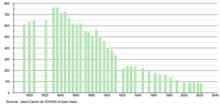 L'évolution du nombre d'habitants est connue à travers les recensements de la population effectués dans la commune depuis 1793. Pour les communes de moins de 10 000 habitants, une enquête de recensement portant sur toute la population est réalisée tous les cinq ans, les populations légales des années intermédiaires étant quant à elles estimées par interpolation ou extrapolation[14]. Pour la commune, le premier recensement exhaustif entrant dans le cadre du nouveau dispositif a été réalisé en 2007[15].