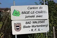 La communauté de communes du pays de Bâgé dont la commune faisait partie jusqu'à sa dissolution est jumelée avec la commune de Bad Waldsee localisée au sud de la Bavière en Allemagne depuis le [28]. Ce jumelage est né d'un échange franco-allemand débuté en 1977 grâce à Roger Poulnard, fondateur du lycée de Bâgé-la-Ville, et à MM. Subreville et Batho, professeurs d'allemand du collège[29]. Ces derniers ont fait une demande de contact avec un établissement de l'Allemagne auprès du Ministère de l'Éducation nationale qui leur ont répondu favorablement en leur proposant la Realschule de Bad Waldsee. Une dizaine de mois après avoir reçu cette réponse, Herr Schültz, professeur de français à la Realschule arrive en France avec 15 collégiens[29],[30]. Ce n'est qu'une quinzaine d'années plus tard que l'échange scolaire devient un jumelage intercommunal. Depuis, un voyage est organisé chaque année et les élèves choisissant d'étudier l'allemand ont un correspondant.
