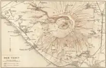 - l'historien grec Strabon (vers -63 - vers 24), dans le livre V, chapitre 4 de Geographica[30] décrit la montagne comme ayant un sommet principalement plat et stérile, couvert de suie et de roches couleur cendre, et suggère qu'il a pu un jour posséder des « cratères de feu ». Il suppose également que la fertilité des versants alentour pourrait être due à une activité volcanique, comme à l'Etna ;
