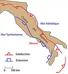 Selon des travaux récents, le Vésuve serait un volcan en zone d'extension (rift)[14]. Cette extension, à l'ouest de l'Italie, serait causée par les contraintes imposées par la collision et la subduction des plaques tectoniques africaine et eurasienne, à l'est de l'Italie, la première plaque, plus dense, plongeant profondément sous la seconde. Les matériaux du manteau terrestre s'hydratent et fondent, formant le magma. Celui-ci, moins dense que les roches solides environnantes, remonte à travers les couches les plus fragiles de la surface terrestre, et finit par former le stratovolcan[15].