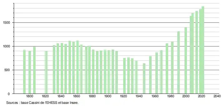 L'évolution du nombre d'habitants est connue à travers les recensements de la population effectués dans la commune depuis 1793. Pour les communes de moins de 10 000 habitants, une enquête de recensement portant sur toute la population est réalisée tous les cinq ans, les populations légales des années intermédiaires étant quant à elles estimées par interpolation ou extrapolation[23]. Pour la commune, le premier recensement exhaustif entrant dans le cadre du nouveau dispositif a été réalisé en 2008[24].