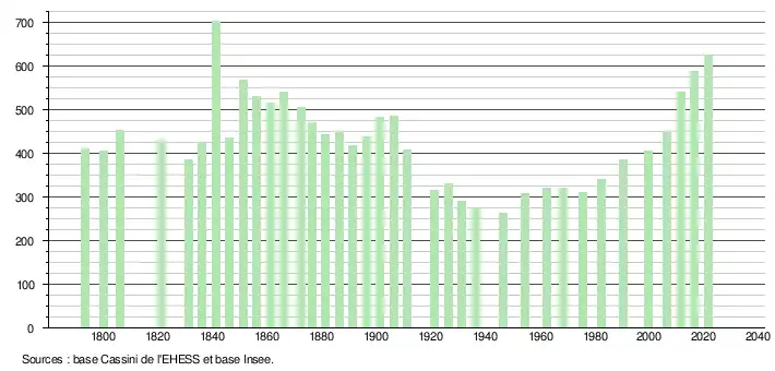L'évolution du nombre d'habitants est connue à travers les recensements de la population effectués dans la commune depuis 1793. Pour les communes de moins de 10 000 habitants, une enquête de recensement portant sur toute la population est réalisée tous les cinq ans, les populations légales des années intermédiaires étant quant à elles estimées par interpolation ou extrapolation[19]. Pour la commune, le premier recensement exhaustif entrant dans le cadre du nouveau dispositif a été réalisé en 2006[20].