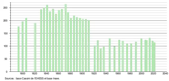 L'évolution du nombre d'habitants est connue à travers les recensements de la population effectués dans la commune depuis 1793. Pour les communes de moins de 10 000 habitants, une enquête de recensement portant sur toute la population est réalisée tous les cinq ans, les populations légales des années intermédiaires étant quant à elles estimées par interpolation ou extrapolation[20]. Pour la commune, le premier recensement exhaustif entrant dans le cadre du nouveau dispositif a été réalisé en 2008[21].