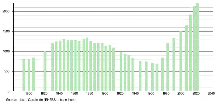 L'évolution du nombre d'habitants est connue à travers les recensements de la population effectués dans la commune depuis 1793. Pour les communes de moins de 10 000 habitants, une enquête de recensement portant sur toute la population est réalisée tous les cinq ans, les populations légales des années intermédiaires étant quant à elles estimées par interpolation ou extrapolation[20]. Pour la commune, le premier recensement exhaustif entrant dans le cadre du nouveau dispositif a été réalisé en 2007[21].