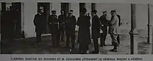L’accord entre Bénazet et le roi est confirmé par les ambassadeurs de France et de Grande-Bretagne le et, le lendemain, le commandant-en-chef des Alliés, le vice-amiral Louis Dartige du Fournet, est reçu en audience par le roi. Quelques jours plus tard, le 3 novembre, Dartige du Fournet prend prétexte de la destruction de deux navires marchands hellènes par un sous-marin allemand pour demander la reddition des vaisseaux de guerre grecs et l’occupation de l’arsenal de Salamine par les troupes françaises[20]. Athènes proteste vigoureusement mais, le [21], le désarmement partiel de la plupart des navires de guerre grecs commence tandis que les Alliés s’emparent de 30 vaisseaux légers[22]. Trois semaines plus tard, les Français prennent complètement possession de la base navale de Salamine et commencent à utiliser les navires grecs pour leur propre compte, avec des équipages français[23],[24],[25].