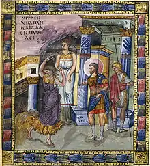 Bien que l’on ait suggéré que le voile couvrant le visage ait été une invention byzantine[14], l’art byzantin ne montre aucune femme la face voilée, même s’il est habituel que la tête soit couverte. On croit généralement que la femme byzantine ne s’aventurait à l’extérieur de la maison qu’entièrement drapée et on ne la montre jamais dans l’art[15]. Les sources littéraires pour leur part ne permettent pas de faire la distinction entre un voile qui couvrirait la chevelure et un voile qui couvrirait l’ensemble de la face[13]. Strabon écrivant au Ier siècle fait allusion aux femmes perses qui se voilaient le visage[16]. Au début du IIIe siècle l’auteur chrétien Tertullien décrit les femmes arabes païennes dont la face est complètement voilée sauf pour les yeux, à la façon du niqab[17]. Cette tradition du Moyen-Orient remonterait donc à une période précédant l’Islam.