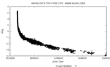 Courbe de lumière de la Nova Cygni 1975 produite à partir des données de l'AAVSO. Les dates sont données en jours juliens.