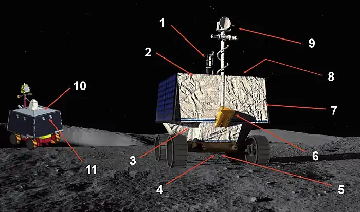 VIPER est un engin de 430 kilogrammes environ haut de 2,5 mètres pour une longueur et une largeur de 1,5 mètre. Il est équipé de quatre roues et est conçu pour parcourir au moins 20 kilomètres à la surface de la Lune. L'énergie est fournie par trois panneaux solaires en position verticale (sur les côtés et l'arrière de l'astromobile) pour optimiser l'exploitation du rayonnement solaire qui est rasant dans les régions polaires. D'une superficie totale de 1 m² ils fournissent au maximum 450 Watts. L'énergie est stockée dans des batteries qui permettent à l'astromobile de survivre durant 96 heures lorsque le Soleil n'éclaire plus les cellules solaires. Pour circuler parmi les cratères sur un sol à la fois en pente et d'une consistance très fine sans s'enliser, l'engin utilise un nouveau type de roulement. Il peut lever de manière indépendante chacune de ses roues pour les dégager. Chacune peut être orientée de manière indépendante et comporte une suspension active. Ceci permet à VIPER de se déplacer latéralement ou en diagonale tout en maintenant fixe son orientation ce qui lui permet à la fois de pointer en permanence vers sa cible scientifique et d'optimiser l'exposition des panneaux solaires. La vitesse de pointe est de 20 centimètres par seconde (0,8 km/h) mais cette vitesse est abaissée à 10 cm/s (0,4 km/h) pour mettre en œuvre les instruments. Pour la navigation et ses recherches VIPER est équipé de caméras. Pour circuler dans des zones où règne une nuit permanente il dispose de projecteurs conçus pour fonctionner avec les caméras dans les conditions extrêmes des régions polaires de la Lune caractérisées par le froid et l'obscurité. L'astromobile est piloté à distance par un opérateur sur Terre : dans le cas le plus courant celui-ci fait avancer VIPER de 4 à 8 mètres puis examine les photos du terrain prises à l'issue de cette avancée pour décider du prochain déplacement. Les informations sont échangées avec les contrôleurs au sol à l'aide d'un émetteur fonctionnant en bande X qui émet directement vers la Terre, une antenne parabolique à grand gain permet un débit de 230 kilobits par seconde. Des antennes omnidirectionnelles peuvent être utilisées pour communiquer avec un débit de 2 kilobits par seconde. Sur Terre la NASA communique avec VIPER via les antennes paraboliques de 34 mètres de diamètre du réseau Deep Space Network de la NASA situées à Canberra, Goldstone et Madrid[21]. L'avionique repose sur un processeur RAD 750 et SP0. Le logiciel de navigation est en partie embarqué et en partie installé dans le centre de contrôle[16].