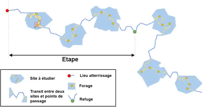 - Une fois sur un site l'astromobile commence par mesurer le degré d'hydratation de la surface en utilisant les instruments NSS, NIRVSS et MSOLO et en se déplaçant à une vitesse inférieure à 10 cm/seconde. Les caractéristiques du terrain sont relevées (température, géomorphologie, minéralogie). À la suite des observations in situ les sites prévus pour les forage sont validés ou éventuellement modifiés. Sur chaque site trois forages séparés de quelques dizaines de mètres sont effectués. (Toutefois lorsque le site est de type PSR (terrain perpétuellement à l'ombre / glace d'eau en surface), un seul forage sera effectué pour prendre en compte les contraintes thermiques et énergétiques propres à ce type de site). Les mesures des éléments volatiles doivent être effectuées sur 10 à 15% de la superficie du site et l'astromobile doit parcourir au minimum 224 mètres à l'intérieur de son périmètre[33].