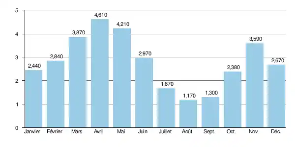 La hauteur maximale instantanée a été de 289 cm ou encore 2,89 m le à 19 h 0. Le débit instantané maximal enregistré a été de 190 m3/s le , tandis que le débit journalier maximal était de 60 m3/s le de la même année[2]. En comparant la première de ces valeurs avec l'échelle des QIX de la rivière, il apparaît que ces crues étaient largement plus importantes que la valeur calculée de crue cinquantennale, et donc fort exceptionnelles.