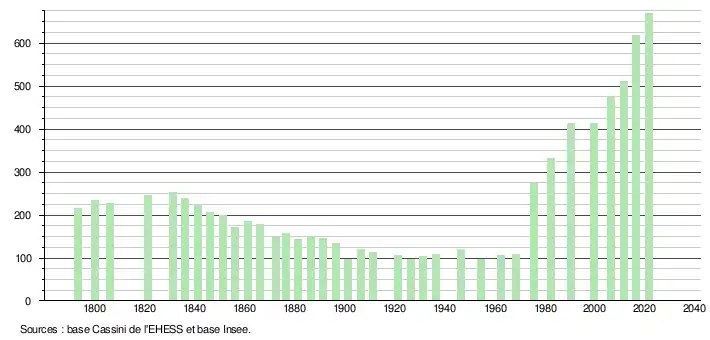 L'évolution du nombre d'habitants est connue à travers les recensements de la population effectués dans la commune depuis 1793. Pour les communes de moins de 10 000 habitants, une enquête de recensement portant sur toute la population est réalisée tous les cinq ans, les populations légales des années intermédiaires étant quant à elles estimées par interpolation ou extrapolation[34]. Pour la commune, le premier recensement exhaustif entrant dans le cadre du nouveau dispositif a été réalisé en 2006[35].