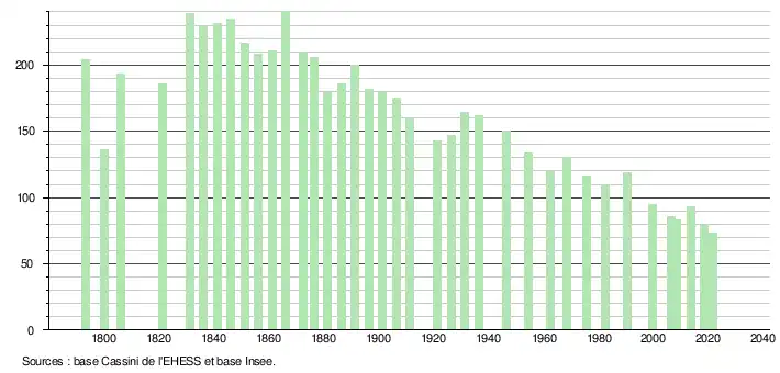 L'évolution du nombre d'habitants est connue à travers les recensements de la population effectués dans la commune depuis 1793. Pour les communes de moins de 10 000 habitants, une enquête de recensement portant sur toute la population est réalisée tous les cinq ans, les populations légales des années intermédiaires étant quant à elles estimées par interpolation ou extrapolation[34]. Pour la commune, le premier recensement exhaustif entrant dans le cadre du nouveau dispositif a été réalisé en 2008[35].