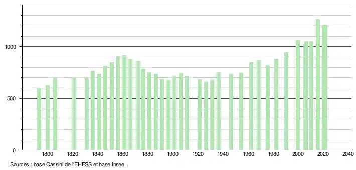 L'évolution du nombre d'habitants est connue à travers les recensements de la population effectués dans la commune depuis 1793. Pour les communes de moins de 10 000 habitants, une enquête de recensement portant sur toute la population est réalisée tous les cinq ans, les populations légales des années intermédiaires étant quant à elles estimées par interpolation ou extrapolation[22]. Pour la commune, le premier recensement exhaustif entrant dans le cadre du nouveau dispositif a été réalisé en 2005[23].