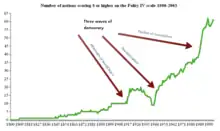 Dans une étude de 2018 dans Perspectives on Politics, Seva Gunitsky de l'Université de Toronto identifie treize vagues de démocratie[5]. Son principal critère est le rejet de du pouvoir absolu, par opposition à Huntington qui a utilisé le critère beaucoup plus restrictif du droit de vote pour la majorité des hommes.