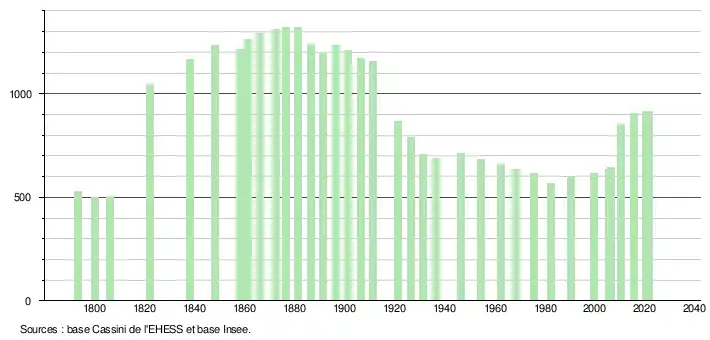L'évolution du nombre d'habitants est connue à travers les recensements de la population effectués dans la commune depuis 1793. Pour les communes de moins de 10 000 habitants, une enquête de recensement portant sur toute la population est réalisée tous les cinq ans, les populations légales des années intermédiaires étant quant à elles estimées par interpolation ou extrapolation[11]. Pour la commune, le premier recensement exhaustif entrant dans le cadre du nouveau dispositif a été réalisé en 2005[12].