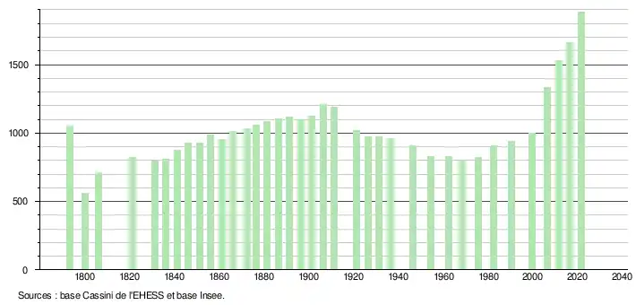 L'évolution du nombre d'habitants est connue à travers les recensements de la population effectués dans la commune depuis 1793. Pour les communes de moins de 10 000 habitants, une enquête de recensement portant sur toute la population est réalisée tous les cinq ans, les populations légales des années intermédiaires étant quant à elles estimées par interpolation ou extrapolation[16]. Pour la commune, le premier recensement exhaustif entrant dans le cadre du nouveau dispositif a été réalisé en 2006[17].