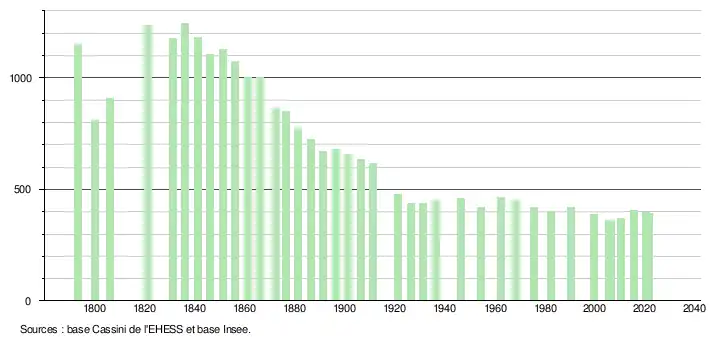 L'évolution du nombre d'habitants est connue à travers les recensements de la population effectués dans la commune depuis 1793. Pour les communes de moins de 10 000 habitants, une enquête de recensement portant sur toute la population est réalisée tous les cinq ans, les populations légales des années intermédiaires étant quant à elles estimées par interpolation ou extrapolation[29]. Pour la commune, le premier recensement exhaustif entrant dans le cadre du nouveau dispositif a été réalisé en 2005[30].