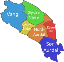 En 1849, Slidre est scindée entre Øystre et Vestre Slidre, puis Etnedal est séparée de Sør et Nord-Aurdal en 1894[7].