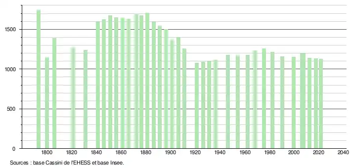 | L'évolution du nombre d'habitants est connue à travers les recensements de la population effectués dans la commune depuis 1793. Pour les communes de moins de 10 000 habitants, une enquête de recensement portant sur toute la population est réalisée tous les cinq ans, les populations légales des années intermédiaires étant quant à elles estimées par interpolation ou extrapolation[31]. Pour la commune, le premier recensement exhaustif entrant dans le cadre du nouveau dispositif a été réalisé en 2007[32]. En 2021, la commune comptait 1 127 habitants[Note 4], en diminution de 0,35 % par rapport à 2015 (Gers : +0,79 %, France hors Mayotte : +1,84 %). |